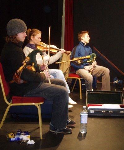 There are 4 profiles (spotlights) at the front of the stage, 4 fresnel gels at the back. These are controlled from a desk control unit with 2 sets of dimmer controls. There are lots of cable connected to this that you could control the lighting from down in the hall.